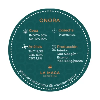 Cultivar Onora te sorprenderá. Su crecimiento es explosivo, con una estructura ramificada y entrenudos cortos, que se cargarán de exquisitas flores en 8 semanas. Su efecto es placentero, meloso y sociable. Definitivamente una variedad a conocer!