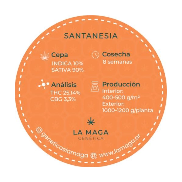 Potente, productora, citrica. Santanesia es una Sativa al 90 % que te dejará regodeando con su sabor cítrico y su efecto activo, risueño y claro. Es cruza propia de Genética la Maga entre Santa María x Amnesia Haze, mejorada para una corta floración para este sativón que deslumbrará a quien la cultiva y a quien la use. Es nuestra variedad registrada con mayor % de THC.